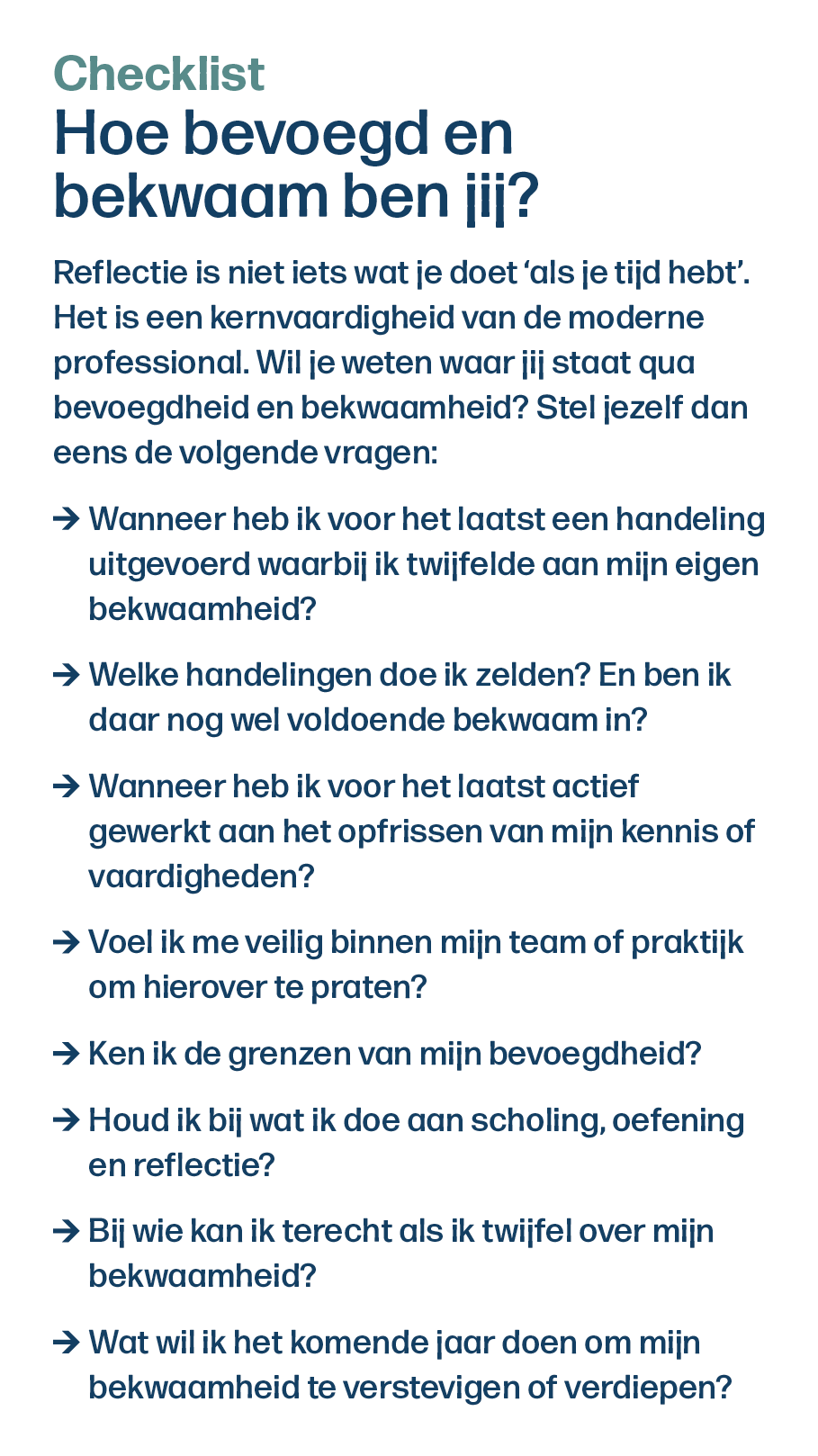 Je bent er dus zelf verantwoordelijk voor dat je bekwaam blijft. Dat vraagt om eerlijke zelfreflectie. Stel jezelf regelmatig de vraag: mag ik iets doen volgens de wet, maar kan ik het ook echt? Heb ik deze handeling voldoende in de vingers? Zonder die reflectie mis je inzichten die cruciaal zijn voor veilige zorg. Twijfel je? Vraag dan anderen hoe zij vinden dat je het doet, collega’s maar bijvoorbeeld ook studenten. Zij krijgen de meest recente leerstof én zien misschien jouw blinde vlekken. Hiervoor moet je je natuurlijk wel kwetsbaar opstellen. Dat kan confronterend zijn, maar het is wel heel belangrijk.