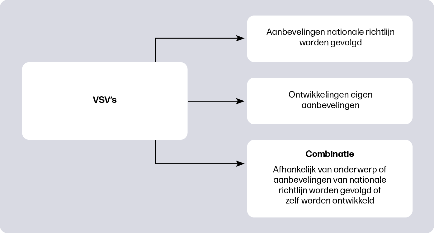 Er waren grote verschillen tussen de regionale protocollen, wat mede de oorzaak kan zijn van de huidige verschillen in inleiden in Nederland. Want dat verschil is groot: recent onderzoek laat zien dat de kans op een inleiding voor een vrouw zwanger van haar eerste kind in de ene regio 14% is en in de andere regio 41%2. Het onderzoek laat zien dat sommige VSV’s de aanbevelingen uit de nationale richtlijnen volgden, terwijl andere VSV’s hun eigen aanbevelingen formuleerden (figuur 2). In bepaalde regio’s varieerde het per onderwerp of de aanbevelingen uit nationale richtlijnen werden gevolgd of eigen aanbevelingen werden geformuleerd. In VSV’s met een hoog percentage inleidingen werd eerder en extra vaak geadviseerd de bevalling in te leiden. VSV’s met een laag percentage inleidingen beschreven meer mogelijkheden om de bevalling door de verloskundige te laten begeleiden en beschreven vaker dat de vrouw de keuze moest maken.